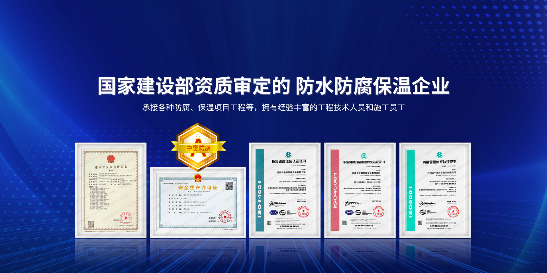 公司經營范圍:防水防腐保溫工程;消防設施工程;建筑裝修裝飾工程;建筑機電安裝工程;電力工程;建筑工程;石油化工工程;工業清洗工程;油罐清洗工程;鋼結構工程;環(huán)保工程;模板腳手架工程;電纜防火封堵、防污閃噴涂、外墻外保溫工程;各類施工勞務作業;設備維修、船舶鉚焊、涂裝;電力工程材料、建材、防水材料、防火材料、防腐保溫材料銷售,并相繼通過了GB/T19001-2008idtISO9001:2008GB/T50430-2007質量管理體系認證證書。GB/T24001-2004idtISO14001:2004環(huán)境管理體系認證證書。GB/T28001-2011idtOHSAS18001:2007職業健康安全管理體系認證證書。公司是中國防腐蝕于防護協會、中國施工企業管理協會、電力協會和中國鋼結構防水協會會員單位。 公司的經營業務涵蓋了石油、化工、電力、冶金、煤炭、船舶、國防、燃氣、水利、環(huán)保、交通運輸、航空及國防軍工和輕紡市政等行業的防腐保溫絕熱設備。鋼結構安裝、防火、防水、金屬噴鍍、聚脲噴繪、陰極保護、防滲透堵漏、玻璃鋼及各種磚版材料襯里、橡膠襯里、煙氣硫和耐酸溶劑腐蝕等工程施工。公司連續(xù)十年榮獲“省市先進施工企業”“安全生產先進單位”“重合同,守信用企業”和“AA***資質企業”的稱號。2000年被命名為市級文明單位,2002年被國家工商行政管理局命名為“重合同,守信用的企業”、被中國工業防腐蝕技術協會命名為“防腐蝕企業,能源節(jié)約及環(huán)境保護領域有豐富的經驗和***的業績。工程一次交驗合格率100%。其中攀枝花鋼鐵公司煉鐵廠四號高爐及熱風爐防腐工程、上海寶鋼公司煤氣柜防腐工程、撫順石油一廠裝置防腐項目、齊魯石化公司稀烴廠高塔防腐工程、吉林化學工業公司煉油廠油罐防腐工程、天津石化熱電廠六號爐頂棚聯絡管保溫工程、大慶油田(太倉)力神泵業工程、中國化學工程第十一建設工程、中原油田勘探局工程、中國石化銷售有限公司華北分部、魯皖輸油管道工程、貴州開磷息烽合成氨工程、陜西黃陵煤化工程、中國石油天然氣西部管道塔里木輸油工程、邯鋼集團邯寶鋼鐵公司煉鐵工程、德州供電工程、吉寶(南通)船廠工程,偃師華潤熱力工程、鄭州熱力總公司。 河南省中惠防腐安裝有限公司愿以豐富的施工經驗,***的技術,***的設備,***的管理,***的服務,竭誠為國內外廣大的用戶提供***滿意、******的工程作品。 我公司愿與國內外同仁一道,團結協作,共同推進防腐蝕行業發(fā)展! 公司地址:河南省長垣縣建設路北段360號 固定電話:0373-8866488 郵編:453400 網址:http://www_zhff_com_cn.yiczs.com